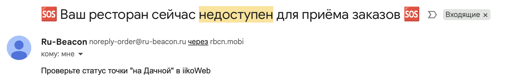 Периодически клиент в письмах и в боте с оповещением о приеме заказов может получать вот такое сообщение 🆘 Ваш ресторан сейчас недоступен для приёма заказов 🆘