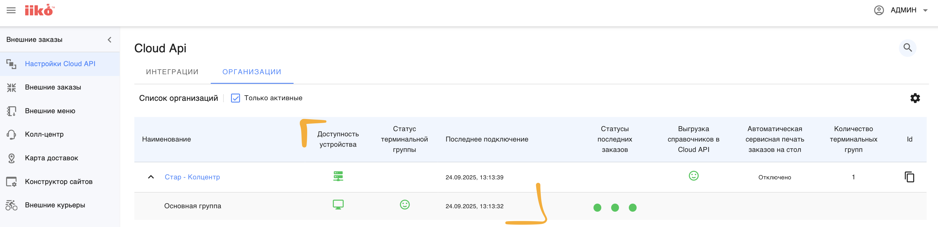 1 - Переходим в iikoWeb в раздел Настройки Cloud API - ОРГАНИЗАЦИИ
