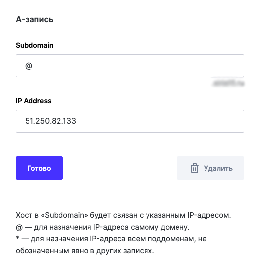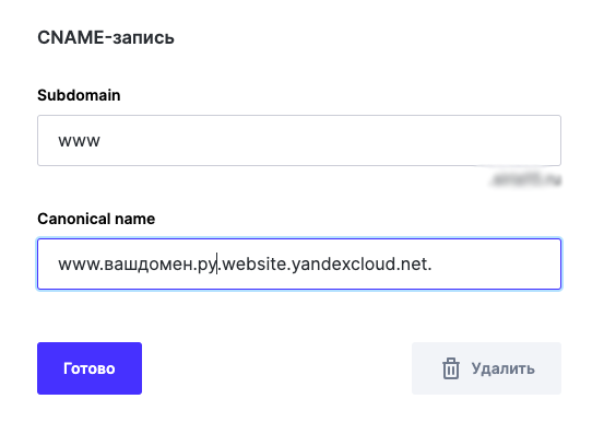 в поле Canonical namewww.вашдомен.ру.website.yandexcloud.net. Жмем “Готово”.