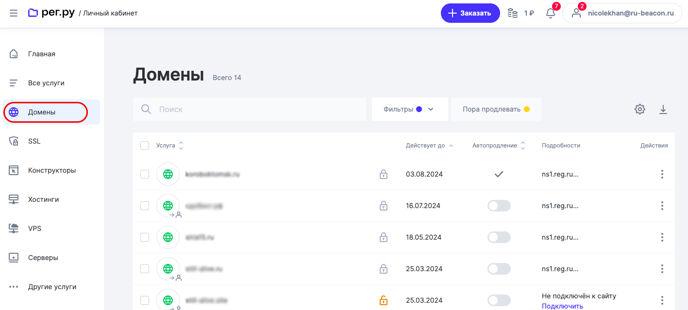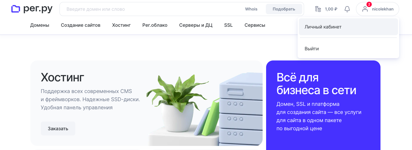 2. Нажмите на имя пользователя и перейдите на страницу Мои домены. Regru1 Regru2