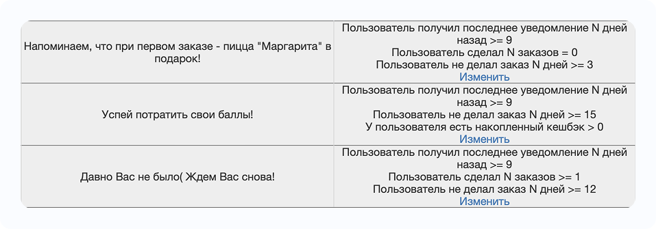 - Можно настроить автоматические рассылки, при которых отправляются push-уведомления. Например: