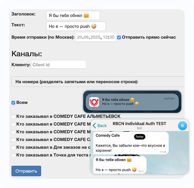 - Можно отправлять сообщения конкретным пользователям по ID гостя в приложении или по номеру телефона.