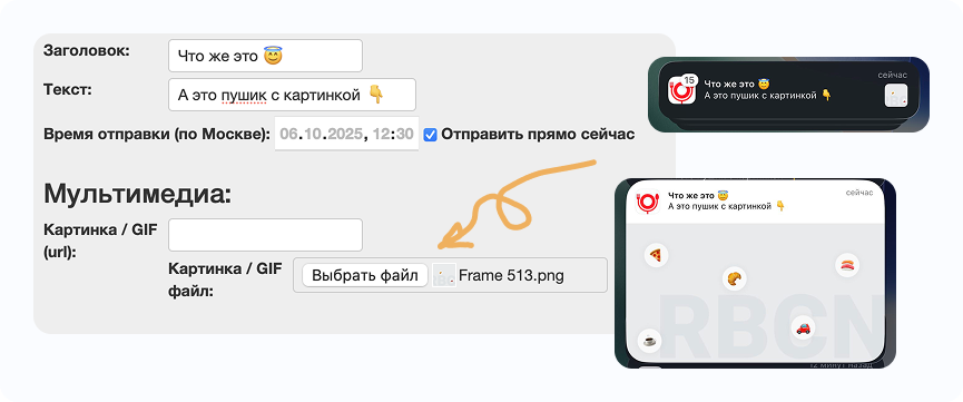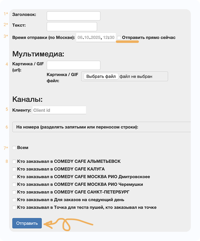 - Время — укажите время отправки (по Москве)* или выберите «отправить прямо сейчас»